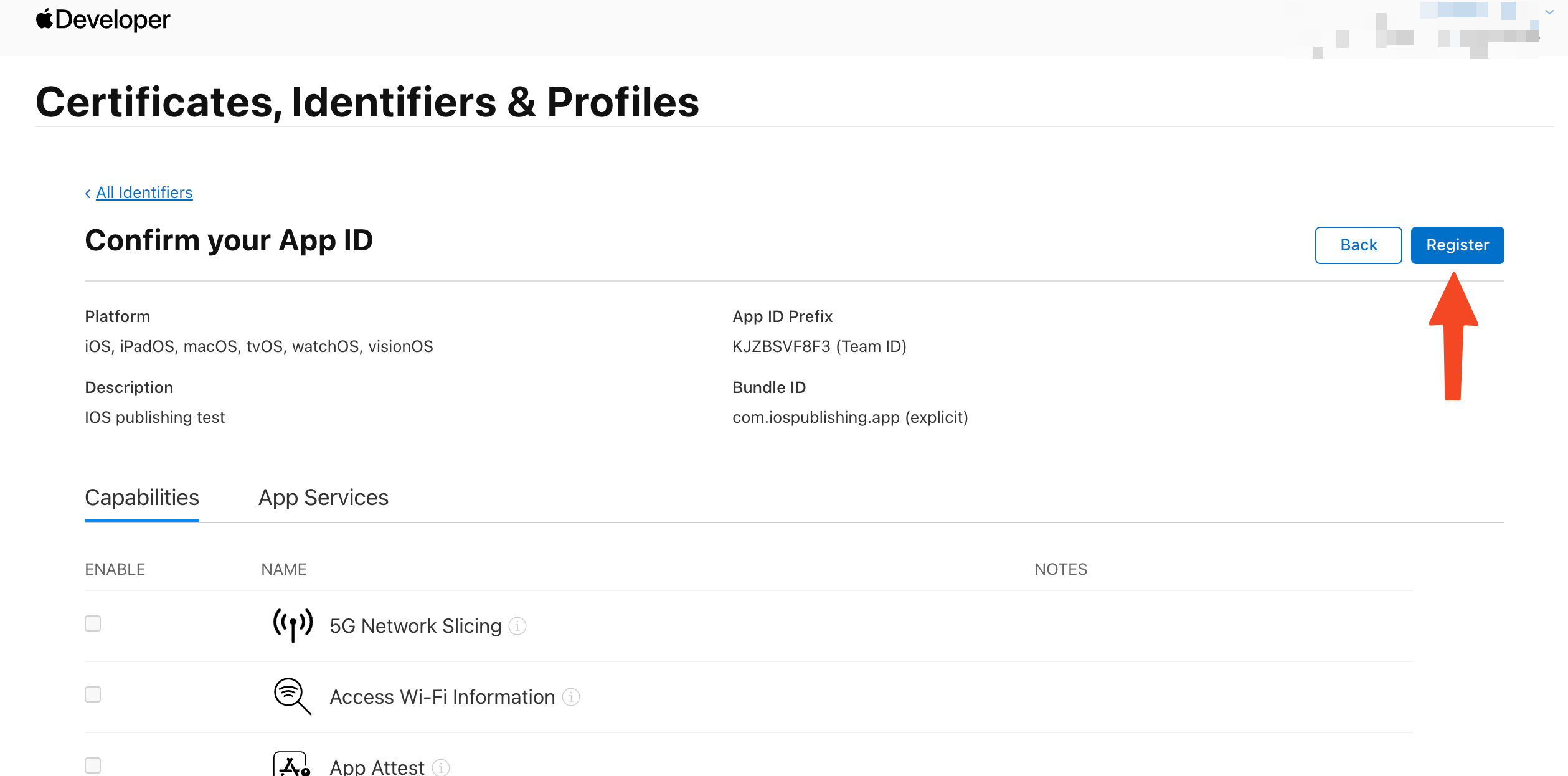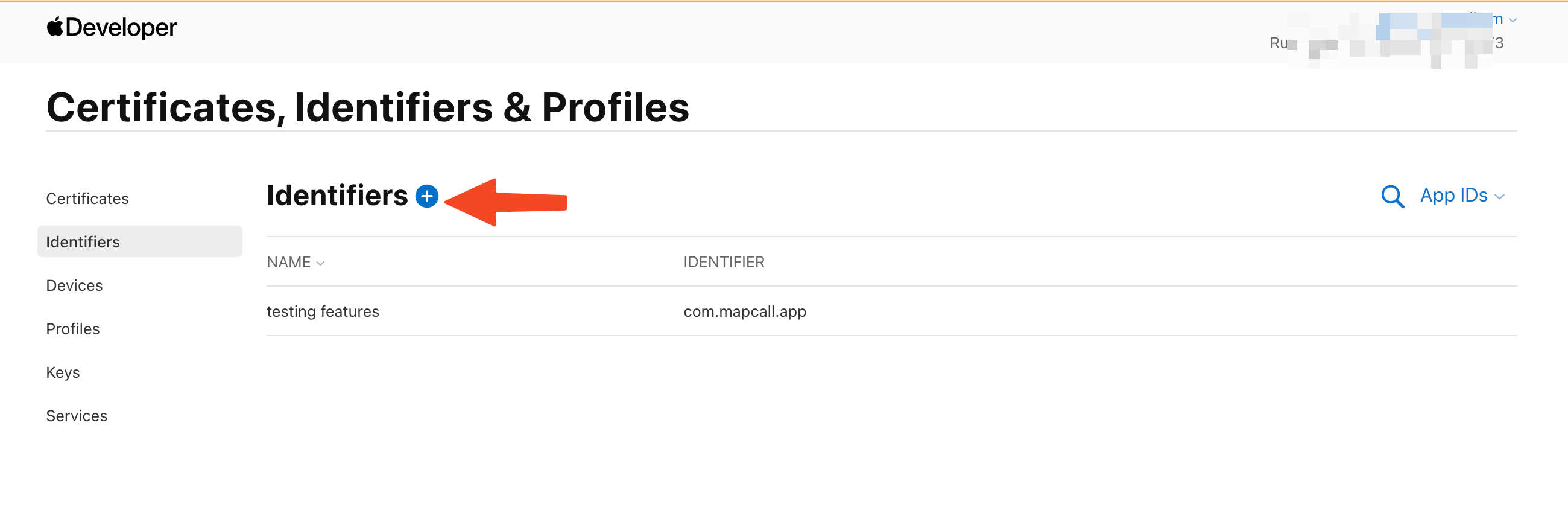 前往你的 Apple 開發者帳號,從憑證、ID & 中選擇識別碼 個人資料區。