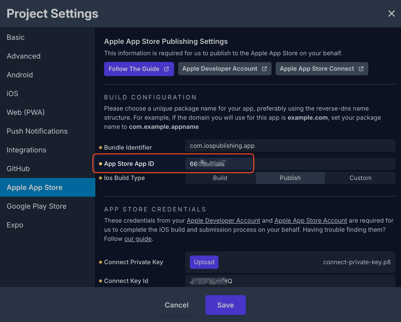 最後,你需要取得分配給新應用程式的 App ID,並加入 尒 Draftbit 裡的 Apple App Store 設定。