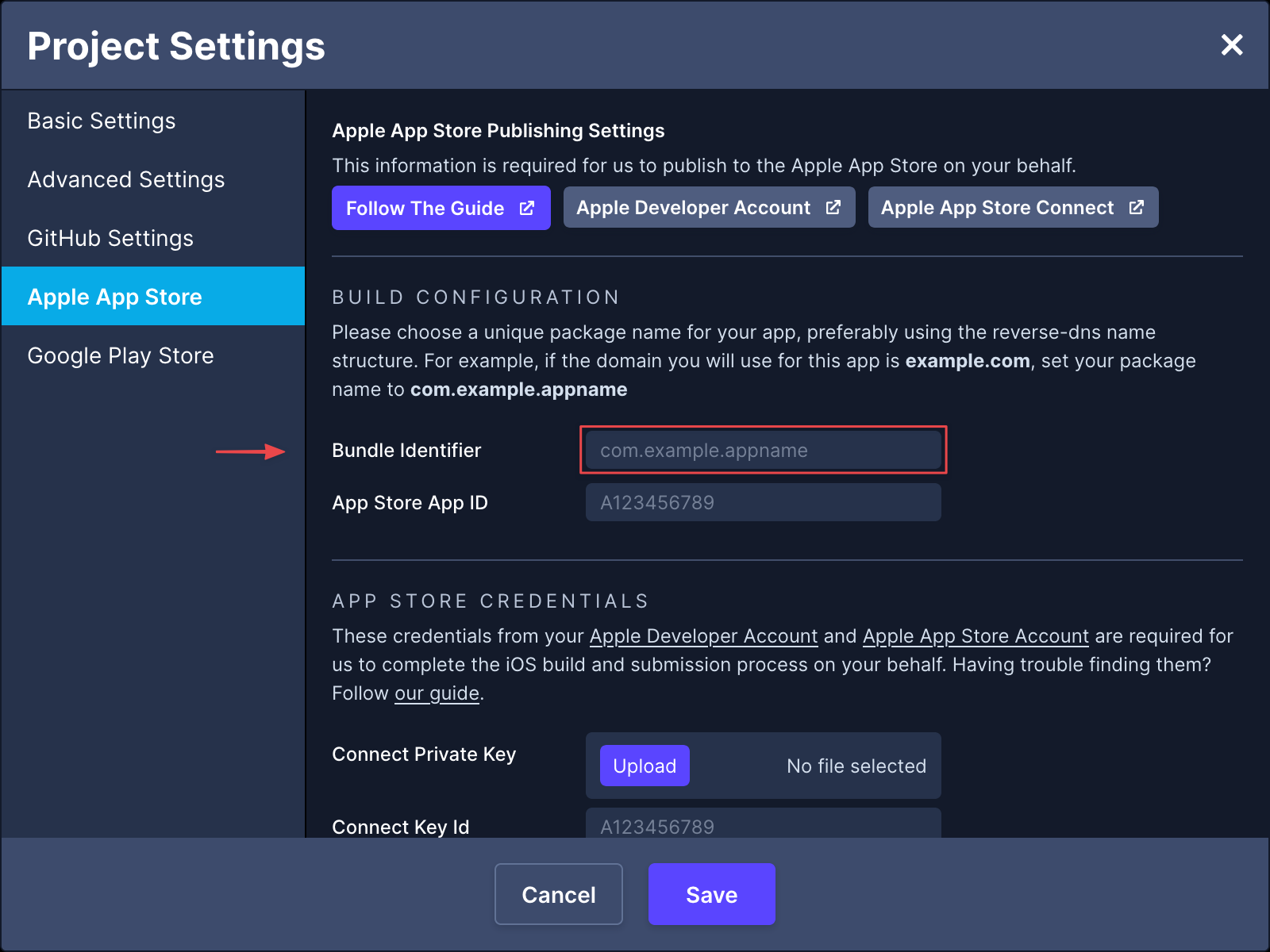 📘 你的 Bundle 識別碼應該使用反向 DNS 名稱結構。 為 舉例來說,如果你將用於這個應用程式的網域是 ,請將你的 Bundle 識別碼設為 。example.comcom.example.appname
