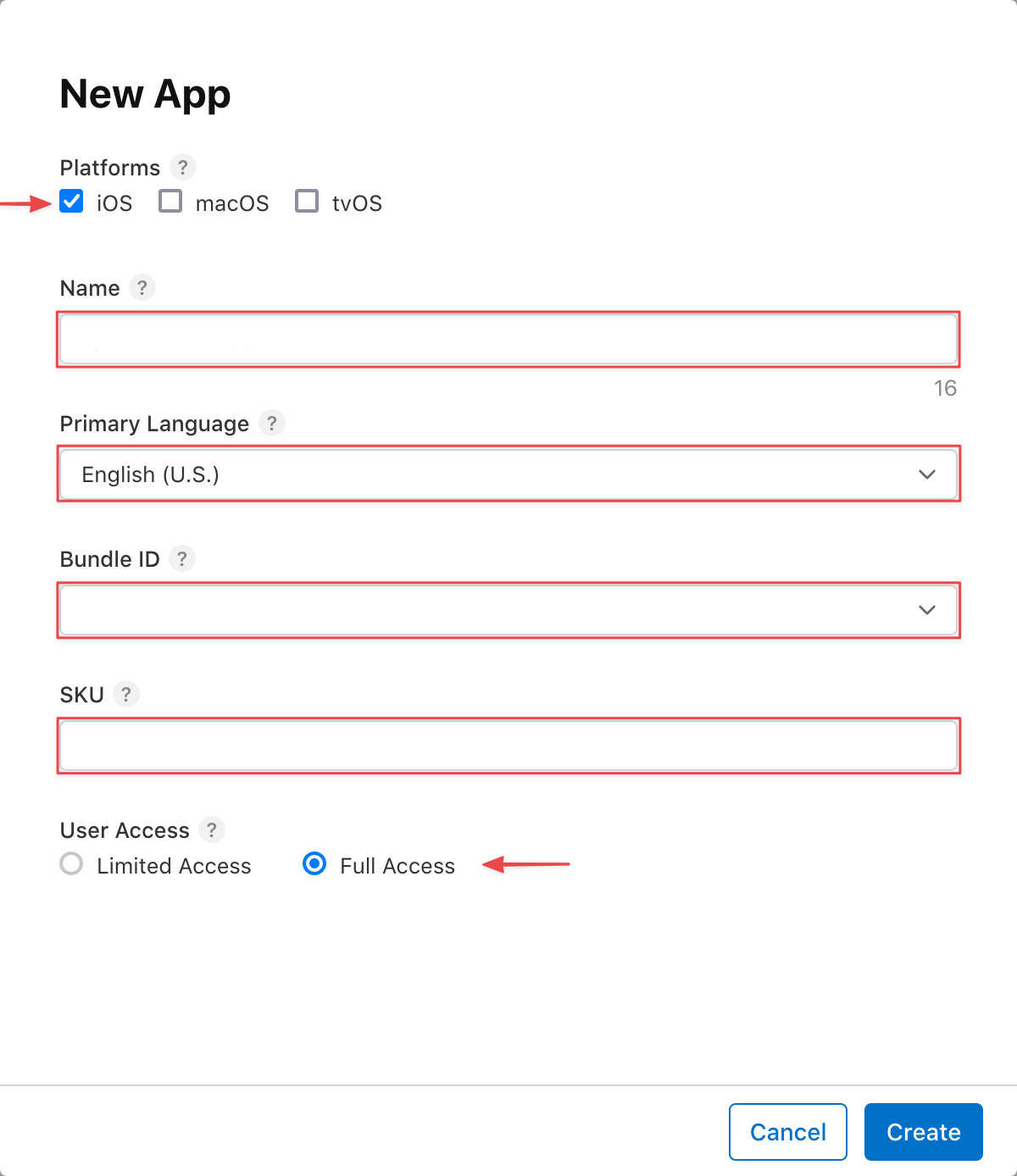 使用者存取權:你應該將此設定設為全 除非你打算只私下使用這個應用程式,否則可以使用。如果你 選擇有限存取,你需要新增以下使用者 你 想要授權使用此應用程式。只有當你 有 其他包含在你 App Store Connect 帳號中的使用者