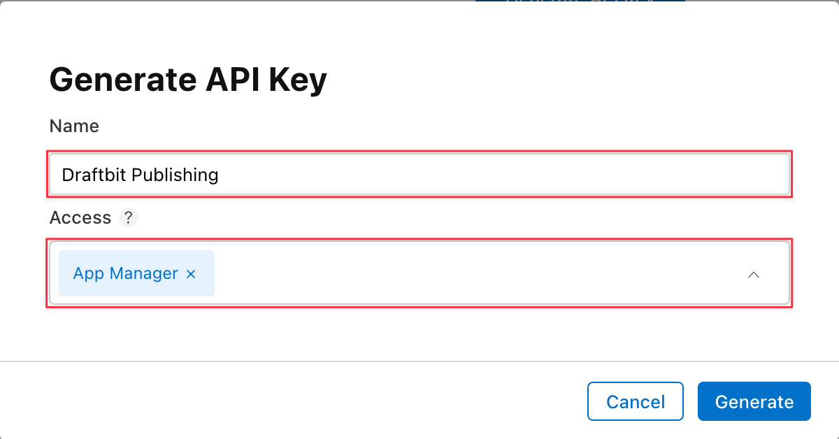 名稱:輸入鑰匙名稱。這是一個參考資料,且是 不 鑰匙本身的一部分。我們建議將其命名為「Draftbit」 出版,這樣未來會更容易辨識。
