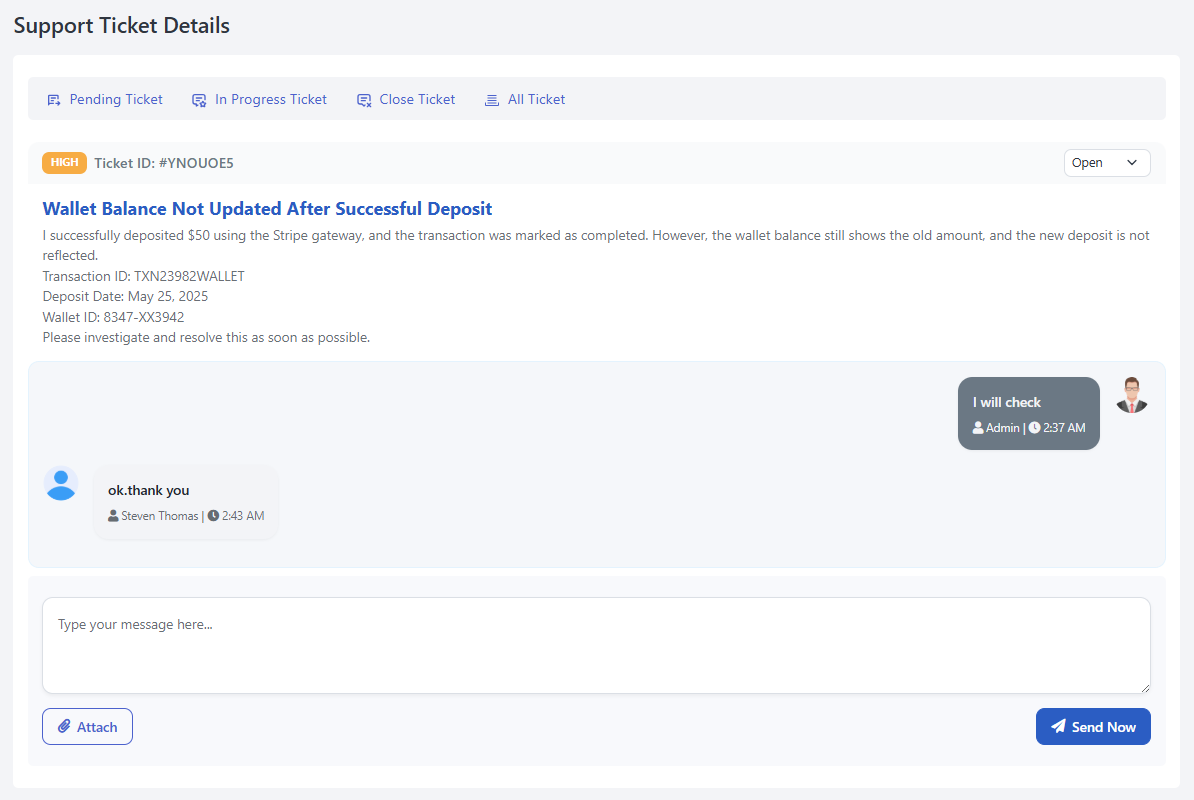 Clicking “Support Now” opens the ticket conversation, where support admins can reply, attach files, and track full ticket history.