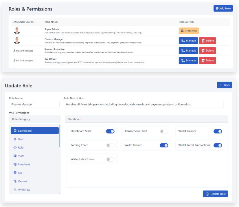 Role Assignment: Assign staff roles to streamline access control (e.g., Super Admin, Finance Manager, Support Lead, KYC Officer).