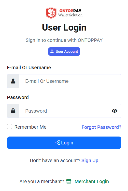 End-users and merchants can log in to their Toppay wallet accounts using their email or username and password. The login form is designed to be clean, fast, and secure.